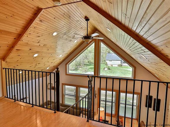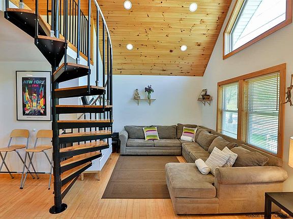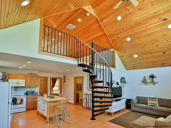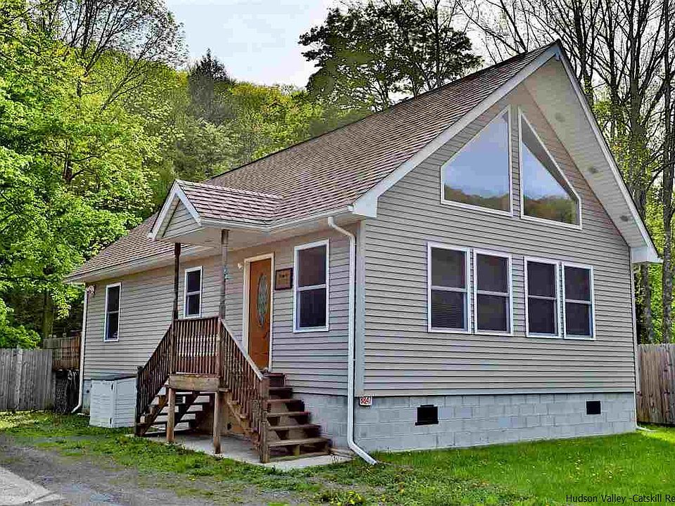 Creekside cutie offers water frontage and mountain views, is close by Phoenicia, skiing, hiking, and the famous Peekamoose restaurant! This lovingly maintained home with wonderful natural light has also been highly successful in short term vacation rentals. Enjoy the high vaulted ceiling, open floor plan and the stylish spiral staircase leading to a large upstairs loft, easily an extra guest room, family room, home office, yoga or art studio, etc. Easy to maintain. Back yard is privately fenced in. Many recent upgrades. Wake to the sounds of the creek and nature as you enjoy coffee on the deck. Enjoy toasting marshmallows by the fire pit, and swimming and fishing right from your own back yard! Only 2.5 hours from NYC. The perfect second or starter home, or a fantastic investment property.