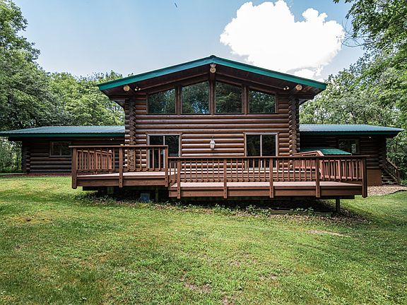 5.16 serene acres with a log home tucked away in the woods. This well maintained home offers an open concept with 3 bedrooms, 3 bathrooms and a 2-car garage. A large kitchen with a moveable center island and an eat-in dining room. This home has main floor living, with a main floor master bedroom and laundry room. It has four decks around the house with privacy from the woods. There is a 40x80 pole barn with doors that are 14-foot high doors, 40x30 of the pole barn has a concrete floor and is heated.