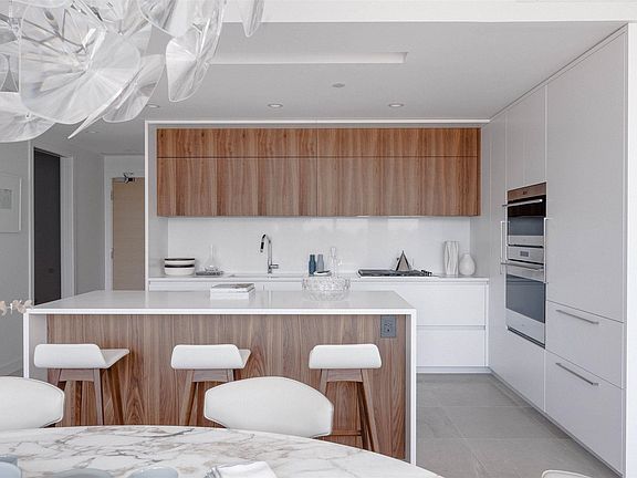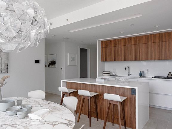 Stunning residence at The Smithe by reputable Boffo Developments. Comprised of 1,429 sf of expansive interior, this 3-bedroom 3 full bath home offers abundant natural light and Southwest views of downtown Vancouver. Designed and furnished by the talented Trepp Design Inc., this home features cabinetry by Binova of Italy, integrated appliances by Wolf and Sub-Zero, over-height ceilings w/ over 38 feet of windows spanning across the living and dining areas, and honed marble flooring throughout. Also featured is geothermal cooling and heating for complete comfort, a 90 sf covered view balcony, impressive resort-style amenities, 24/7 concierge service as well as 2 side x side parking stalls w/ an EV outlet. The quality of this home & development are certain to impress.