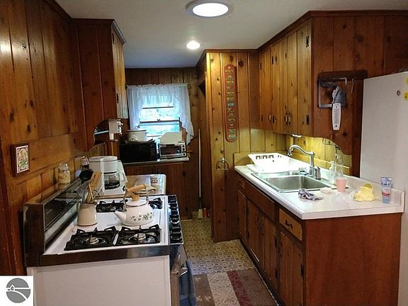 Don't judge a book by it's cover! You must see inside! Cute and cozy 1 bedroom cottage with frontage on the Cedar River. Pretty property on quiet country road and the river is divided into many fingers through this stretch. Inside is a surprise with nice galley kitchen with dining area, large knotty pine paneled living room with cozy woodstove (gas) in the corner. Nice deck off the living area with roofover. Bedroom has double bed and bunks and closet area. Full bath. Michigan basement. Older garage for addtl. storage. Very peaceful, pretty property.
