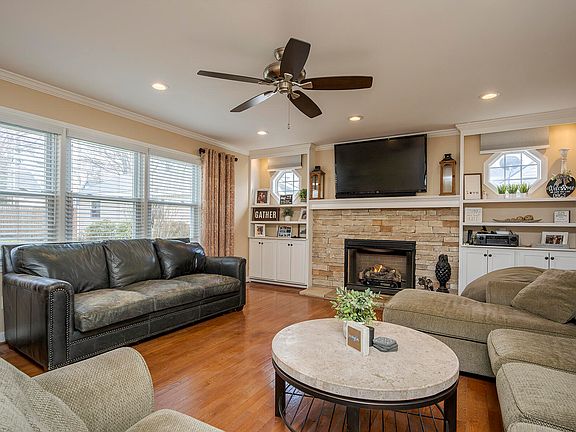 Welcome to this charming 1.5-story home, perfect for comfortable living. Featuring a covered front porch, this home offers a warm and welcoming exterior. Inside, you'll find beautiful hardwood floors that flow throughout the space. The spacious family room addition, complete with a gas fireplace and built-in bookshelves, creates a cozy retreat for gatherings and relaxation. The kitchen offers a nice eat-in area for casual dining. The home also boasts a large two-car garage with a workshop area, providing plenty of storage and workspace. Outside, the yard is wired for an underground fence, ideal for pet owners. The roof was recently replaced in January, ensuring peace of mind for years to come. This home is a perfect blend of charm, functionality, and modern updates!
