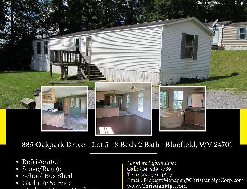 885 Oakpark Drive - Lot 5 ~3 Beds 2 Bath~ Bluefield, WV 24701 LEASE OPTION(Path to Home Ownership): Initial payment: $1,500 with no payments due until the 1st of the following month! Monthly payment: $645/month includes lot rent and curbside trash service. No utilities included. or RENTAL: Security Deposit: $645. Can be made in payments if needed. Monthly payment: $645/month includes lot rent and curbside trash service. No utilities included. Sorry, this home is not HUD approved. This spacious 3 bedroom, 2 bath home is located in the Oaks MHP in Bluefield, WV. Conveniently located close to Rt. 52. This home has an open concept, lots of cabinet space, fresh paint, master bathroom with soaker bathtub and double sink vanity, washer & dryer hookups and amazing views! Christian Management Corporation Office Hours: M-F 9am-5pm & 10am-2pm the 1st Saturday of every month You can view THIS property 7 days a week! Most pets welcome with a $200 pet fee and signed pet agreement. Maximum 2 pets. No aggressive breeds or outside only animals due to insurance restrictions. Clean, safe, quiet, crime & drug free is our goal. We Support Equal Housing Opportunities! Good people with good, bad, low, or no credit but stable employment or Social Security are welcome. Criminal Checks: -NO recent felonies in the last 7 years -NO evictions in the last 7 years -NO sex offenders Is this property not what you are looking for? View our other available #homes, #mobilehomes, #apartments, and more on our Facebook or our Website.