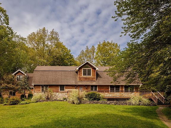 This gambrel roof Dutch Colonial style home is privately sited on 12+ acres overlooking a pond. Up a country drive under a beautiful canopy of mature trees, enter the home along the full length front porch. There is a kitchen with large pantry, dining area and 1/2 bath in the center of the structure. Two bedrooms and a full bath, laundry and mud room accessed via the attached 2 car garage are on the west side of the home. To the east, find a double height living room and stone faced wood burning fireplace, with sliding glass doors to the patio. Upstairs find a den, an office, a primary suite and bonus room over the garage. Over 3,000 square feet of living space, refinished wood floors and a neutral palate define the interior. Outside enjoy nature and privacy conveniently located close the the Taconic State Parkway, halfway between the popular Villages of Rhinebeck and Millbrook, NY.