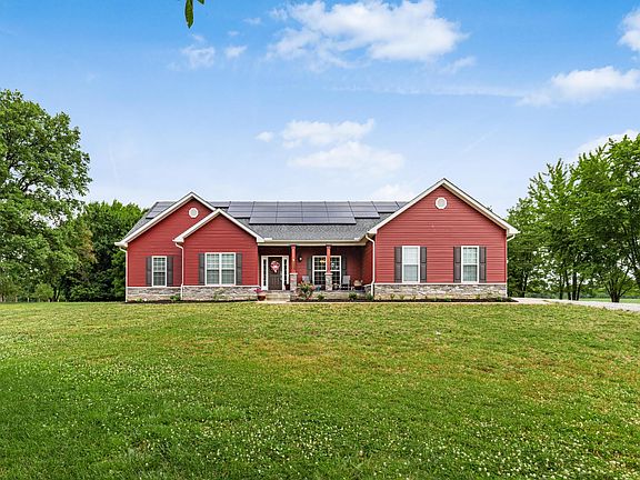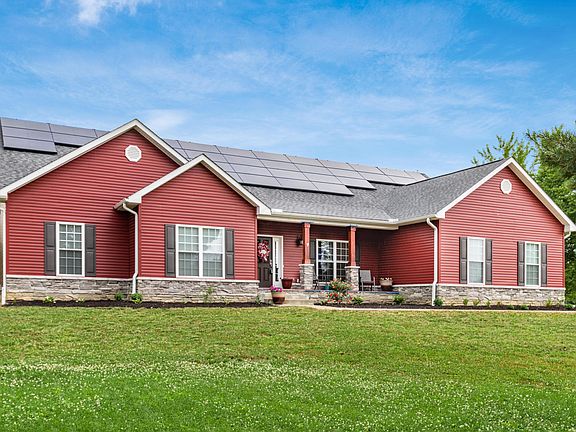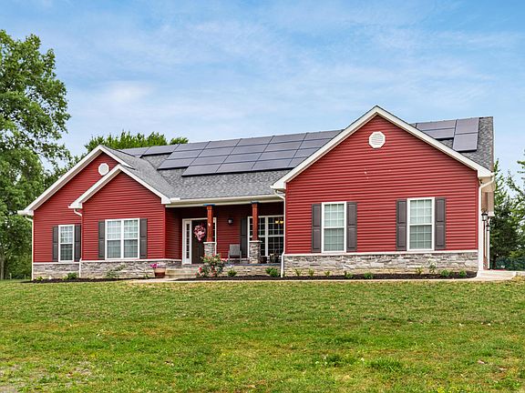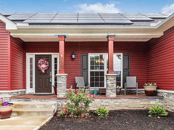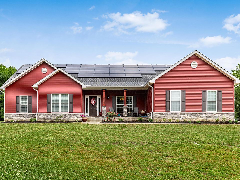This 3 bedroom 2 bathroom Ranch-style home built by American's Home Place. The property sits on a sprawling 2 acre lot surrounded by trees. The Olentangy School District is an added bonus, making this home an excellent choice for families w/ school-aged children. Upon entering the home, you are greeted by a spacious front porch that leads to an open floor plan with 11' vaulted ceilings, creating a bright & airy atmosphere. The interior features warm oak wood flooring throughout, custom blinds, & wood-tiered kitchen cabinets against beautiful granite countertops. Stainless steel appliances & natural lighting add to the home's charm, making it a perfect place to entertain guests. The property offers modern comforts like public water & sewer, along w/ solar panels. Shed offers adt storage.