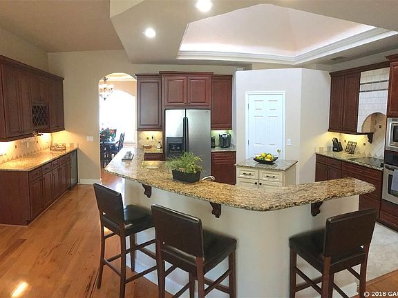This extraordinary home features extensive hickory wood floors, high ceilings, beautiful moldings, aesthetic ceiling detailing, a spectacular kitchen with granite counters, wood cabinets, temperature controlled wine chiller, stainless appliances all on a spacious 1.4 acre lot. The exceptional floor plan includes a family room with cozy gas fireplace, a living room, a beautiful and bright dining room and a stylish study with fantastic built-ins. The relaxing master suite includes his and her closets, dual vanities, glassed-in shower and a double-sided fireplace. The over-sized screened lanai is an outstanding area to relax or entertain. All of this is located minutes from Publix shopping and an easy commute to UF and Shands.