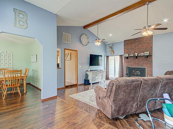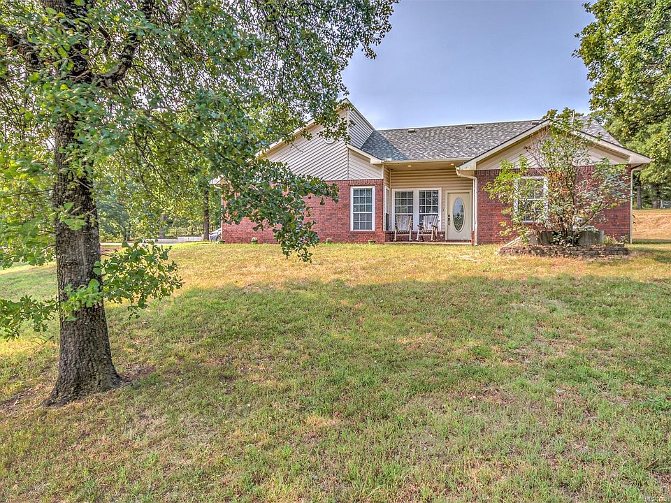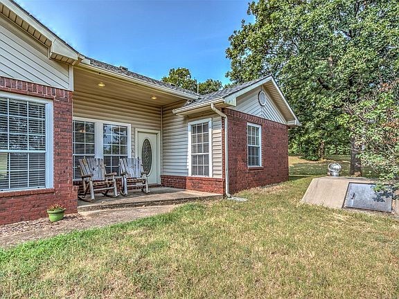 This country home within 2 miles of Skiatook Lake is located on 2.4 acres, and mature trees. Formal Dinning room, large living area with vaulted ceilings, fireplace insert and blower, wet bar for entertaining. 2 car side entrance garage. Large concrete pad ready for shop to be built on it. Large exterior storm cellar.