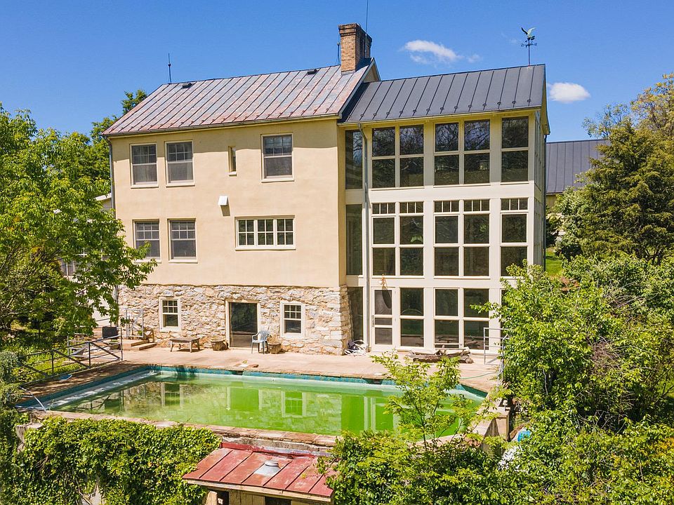 Over the Mountain Farm is a stunning, unique property with the attributes and conveniences of a modern home and the serenity and charm of a European country estate. This idyllic property occupies 81 private acres in the foothills of South Mountain, containing forest, fields, pastures, foot trails and almost half a mile of Beaver Creek meandering through the property. The main house is a three-level home containing nearly 7,000 square feet of amazing living space. The main floor contains a large, two-story sunroom with dramatic views of the creek and hills. Also on the main floor are a large dining area and kitchen equipped with Wolf and Sub-Zero appliances, a cozy family room with gas fireplace, an in-law suite with full bathroom, an additional half bath, and hardwood floors throughout. Upstairs is a bedroom and half bath, as well as a lovely master suite containing two walk-in closets, a laundry room and a bathroom including double vanities, a jetted tub and a stall shower. The lower level of the home features a rec room with floor to ceiling windows, a wet bar, a half bath, storage areas, and a library room featuring the home’s original civil war era stone fireplace. The main house is surrounded by a stone and glass addition, patios, and an in-ground pool. Located close to the main house is a bank barn containing a main hall great room, apartment, guest suites and an artist's studio. The bank barn comfortably sleeps 10 people, with 2 full bathrooms and 2 half bathrooms. Also on the grounds is a four-bedroom tenant house, a detached two car garage, a large greenhouse and two large barns. Twelve acres of the property are certified for organic vegetable production and some pastures are fenced for cattle. Chickens and llamas have also roamed the fields. A successful Airbnb has operated in the bank barn for several years. The land offers itself to crops, horses, a vineyard, and unlimited other possibilities. It is conveniently located with access to three urban centers: Frederick, Baltimore and Washington, DC. This is a unique property that has been lovingly maintained, restored and renovated with unsurpassed attention to detail. It is truly an experience to remember for all who enter Over the Mountain Farm.