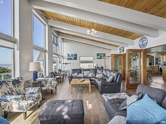 Nestled along the captivating Oregon coastline, 88514 3rd Ave in Florence offers an enticing retreat embodying the essence of coastal living. With an impressive main level spanning 1,280 square feet, this residence welcomes you with an expansive open floor plan that seamlessly merges elegance and functionality.The main level unveils a captivating living area adorned with vaulted ceilings and floor-to-ceiling windows that showcase breathtaking panoramic ocean views. These stunning vistas create an idyllic backdrop for whale watching and relishing awe-inspiring sunsets. The living area extends to a delightful deck, enhancing the experience of the coastal panorama.An open kitchen, generously appointed with ample cupboard space and adorned with tile counters, seamlessly connects to the dining area and family space, fostering a warm and inviting atmosphere. Completing this level is a full bathroom, catering to convenience and comfort.Descending to the lower level reveals a haven of tranquility with five bedrooms, a full bath, and a laundry area. Throughout both levels, newer vinyl flooring adds a touch of modernity and durability, elevating the home's appeal.This property holds additional allure as an established short-term rental, offering a turnkey opportunity for those seeking a furnished haven by the sea. The seller generously includes the transfer of established rental websites, boasting an impressive five years of positive reviews.Embrace an extraordinary chance to own a residence with remarkable Pacific Ocean vistas, promising not just a home but an experience?an invitation to immerse oneself in the coastal allure and bask in the beauty of Oregon's scenic coastline.