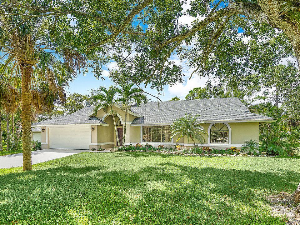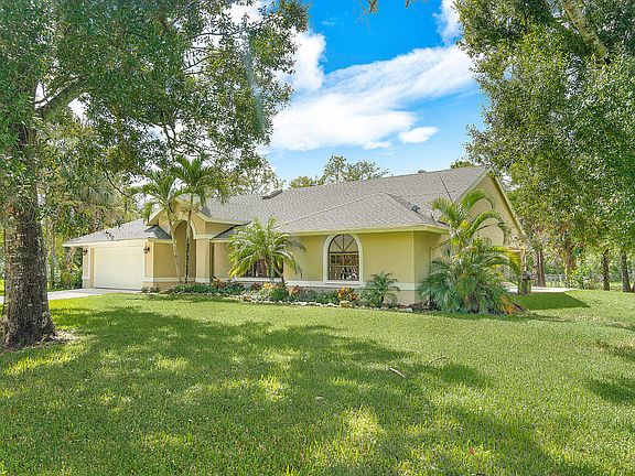 Peace and tranquility can be yours in highly sought after Palm Beach Country Estates. This beautiful 4 bedroom, CBS, pool home sits on a private, well maintained, 1+ acre lot. The property is fully fenced and backs to canal for added privacy. The open kitchen has gorgeous cabinetry, stainless steel appliances and granite counters. Volume ceilings and sky lights bring in lots of natural light. The bathrooms have been updated with fine finishes. Relax under the covered patio or in the pool. The pool deck has been finished with a high end mountain stone. The home has been meticulously maintained and was recently painted. The a/c is brand new. This property also offers a separate air conditioned office or storage space.