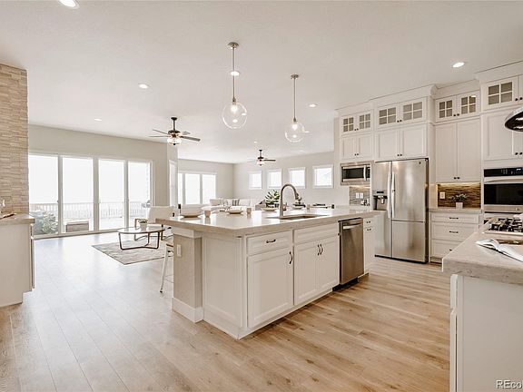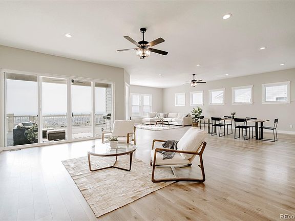 SPECTACULAR, PANORAMIC VIEWS from the Foothills to Downtown Denver and Beyond! Welcome home to this one-of-a kind, beautifully appointed, semi-custom Ranch home located atop one of the highest ridges in West Arvada and backing to open space. This home offers a very unique floor plan with 4 bedrooms + 4 baths on the main level plus 2 additional bedrooms + 1 bath in the finished walk out basement. This is A VERY RARE ranch floor plan! The home is exceptionally finished with over $200,000 in designer and builder upgrades. Some highlights include double stacked upper kitchen cabinets, cased windows, luxury wood laminate flooring throughout main living areas, designer tile and lighting, gorgeous kitchen island, huge walk in pantry, open concept great room with gas fireplace and VIEWS FROM EVERY WINDOW! From the main great room there are lanai style sliding doors that open out to a 550 sq. ft. deck that is partially covered and offers access to the low maintenance lower yard with professional landscaping including year round turf lawn. Located in the popular Leyden Rock neighborhood with easy access to Golden, Downtown Denver and Boulder. The community offers 17 miles of trails that interconnect with a comprehensive regional trail and open space system. The community includes neighborhood parks, a community pool and clubhouse and is filled with open space, trails and wildlife to enjoy. Come see this AMAZING HOME!