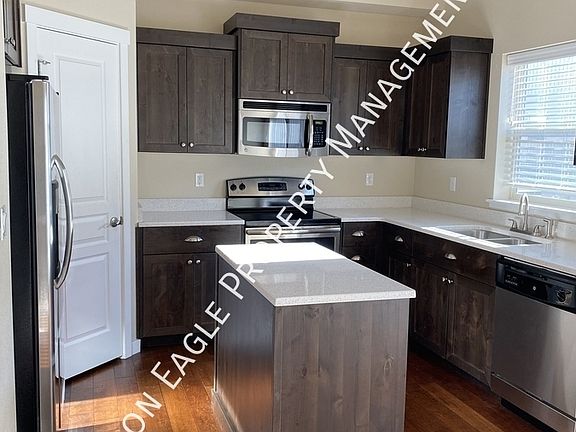 Fantastic townhome in Boise! Beautiful flooring throughout, quartz counter tops, SS appliances, new light fixtures, and Nest thermostat. Walkout balcony off dining room. Two car tandem garage. All landscaping taken care of by the HOA. Tenant responsible for electric and w/s/t. Washer/dryer included. Community features pool, dog park, fitness room and playground. Renters insurance required. Additional $10 per month for filter delivery service. Information deemed reliable. Applicant to verify all. Photos are of a similar unit, cabinets are light, countertops are dark.