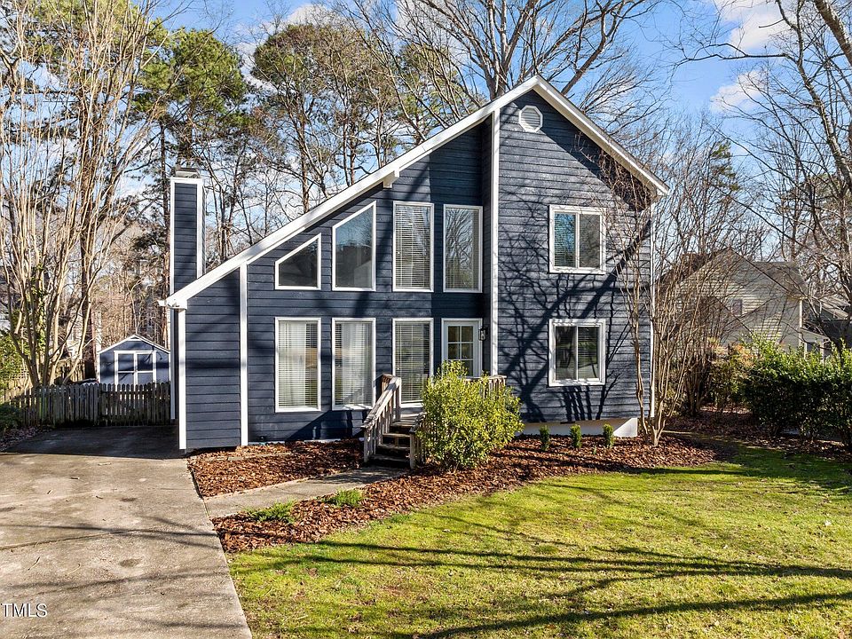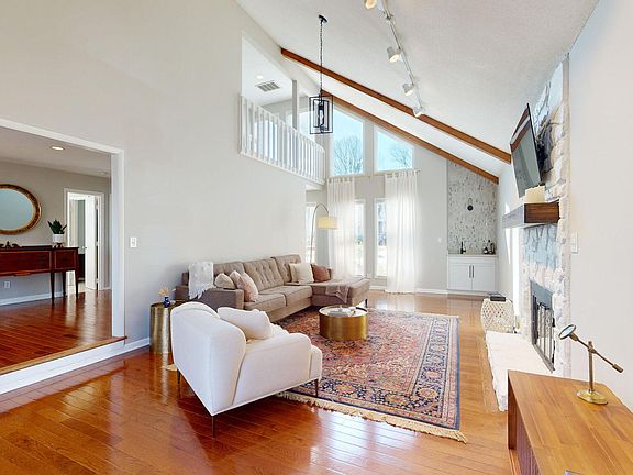 Beautifully updated soft contemporary home - Light filled 2 story family rm w/ vaulted beamed ceilings, soaring full profile stone facade fireplace, hardwood floors and wet bar - Sleek kitchen w/ updated S/S appliances , backsplash and granite countertops - Owners bedroom could be up or down - New cement fiber siding and new front door in 2022 - New hvac in 2022 - Fenced in backyard - Flat, wooded lot on quiet street - Neighborhood pool and tennis