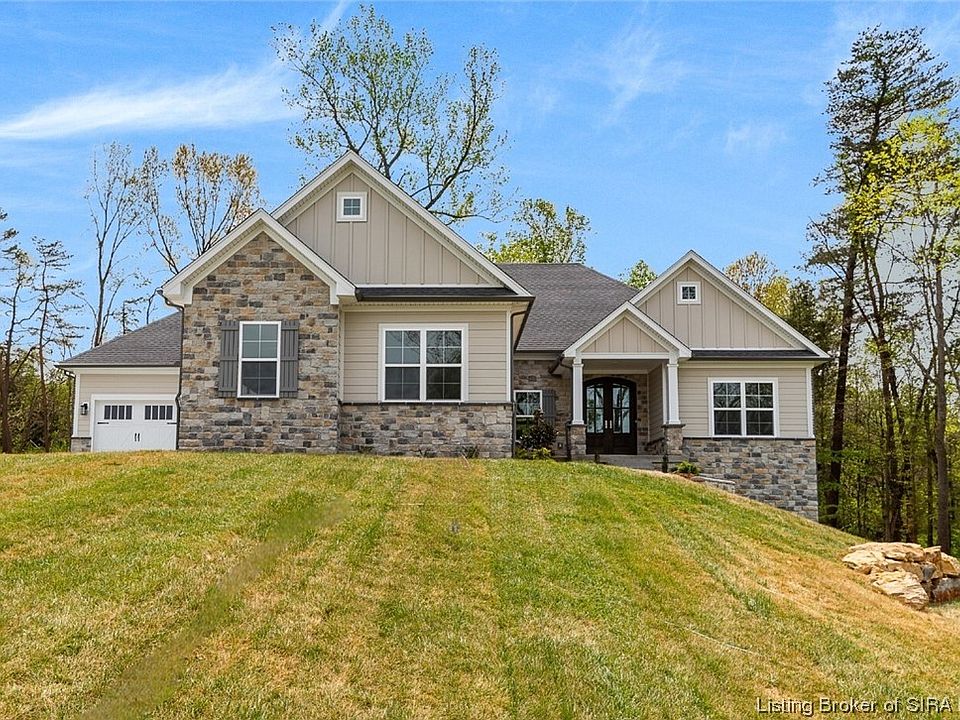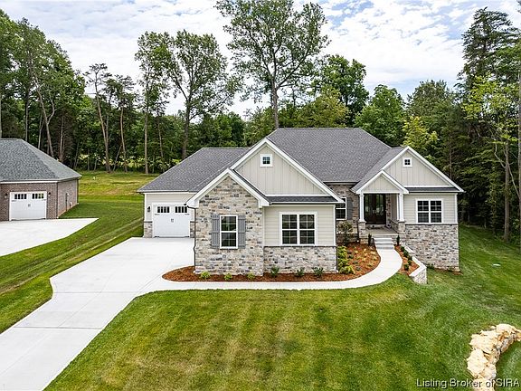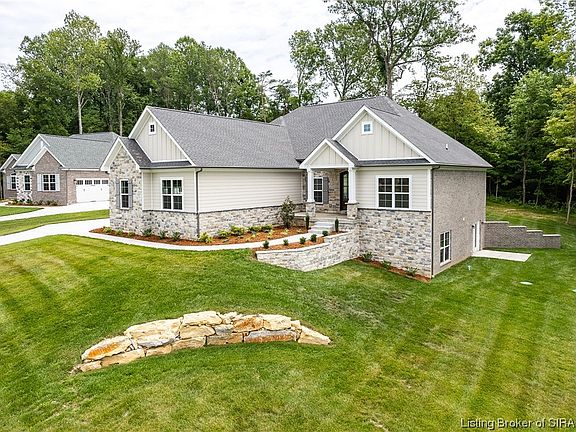 WHY CUSTOM BUILD when DISCOVERY BUILDERS has already Designed this AMBROSE III PLAN with CUSTOM HOME Features, including, 11' Ceilings in Foyer, Great Room, Kitchen & Dinette, all with Crown Molding. This Hardie, Brick, & Stone Ranch Style Home includes a 3-Car Tandem Garage, a Large 12' x 18' Covered Deck with additional Open Decking & Extensive Lower Level Patio Space accessible from the Side Walkout Lower Level. This home includes approximately 3,500 SF of Professionally Designed & Decorated Space with DISCOVERY BUILDER QUALITY throughout. This Split Bedroom Ranch plan sits in a beautifully WOODED Lot in Award Winning Floyd Central High School District. ALL Rooms are Spacious & Well Appointed. The Owner's Suite includes a Hip Vaulted Trey Ceiling with Crown Molding. The Owner's Luxury Bath includes a Large Walk-in Corner Tile Shower with (2) individual vanities & (2) Linen Closets. The Owner's Walk-in Closet is connected to the Laundry Room for Easy Access. This Plan also includes a POWDER BATH for Guests, a WALK-IN PANTRY & Owner's Entry with a Bench and Cubbies. The Lower Level is Finished with 9' Foundation Walls & Lots of Natural Light. There's a 4th BR with Walk-in Closet, a 3rd Full Bath, Family Room/Media & Game Table area & a WET BAR. This home also includes Upgraded Stainless Kitchen Appliances. Sq ft & rm sz approx