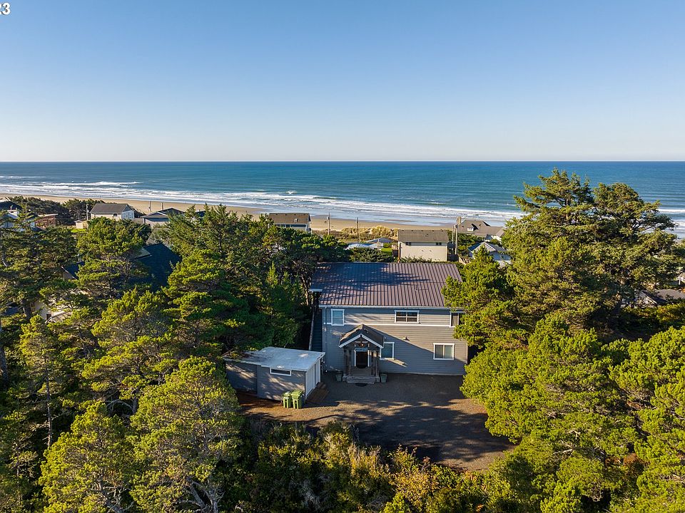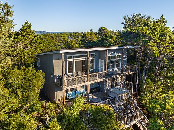 Watch the waves dancing on the ocean from this stunning modern house on the hill. This thoughtfully designed split-floor plan home has a primary bedroom suite on each level, two additional bedrooms, a wide hallway, tall ceilings, quality flooring, and trim throughout. Both bedroom suites have an exterior door to the deck. The kitchen, living, and dining combination great room is perfect for entertaining. It features beautiful marble countertops with a matching kitchen island/eat bar, a propane fireplace with plenty of natural light pouring in through large windows, and sliding glass door. The walk-in pantry and custom cabinets provide plenty of kitchen storage. This thoughtful design continues outside with a metal roof, gravel driveway, keyless entry, expansive covered deck on both levels, and stairs leading to a trail for more convenient beach access down the street. No HOA. Hot tub included. This home is an established vacation rental and could be a turnkey vacation rental opportunity.