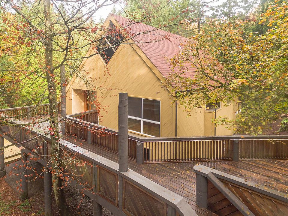 Want to live in your own wooded park? Want to live close to the city? Then you have found home! Hardwood floors welcome you in to the Chalet style, high vaulted ceilings and views of your wonderful outside acreage. Updated kitchen, SS counters, Dacor gas range and large pantry. 2 Master Suites, family room with slider to a fenced yard for kids and pets. Detached garage with awesome office/craft room/bonus room above.