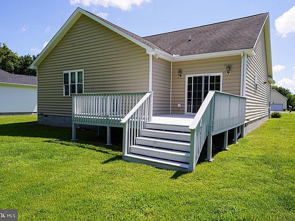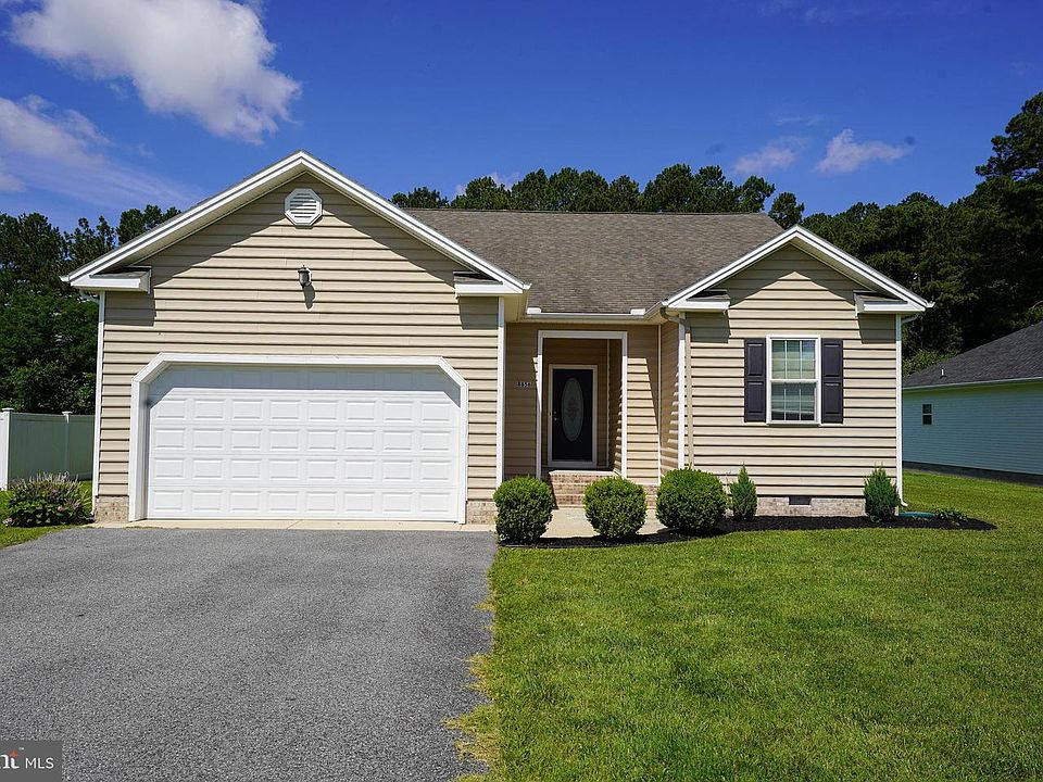 Welcoming contemporary rancher on a roomy lot backing to trees in Delmar's Breckenridge neighborhood. Minutes to parks, dining, events, Salisbury's north-end shopping hub, and the bypass, but tucked away on a quiet culdesac. Great floorplan 3BR/2BA with new LVP tile in the kitchen/dining, laundry, and bathrooms, new carpet in the bedrooms. Large living room with vaulted ceilings, laminate wood floors, and a cozy fireplace. Bright and sunny kitchen/dining room w/breakfast bar, pantry, and sliders out to the deck - ready for summer BBQs! Incredible owner's bedroom - two walk-in closets, full, en-suite bath featuring double-sink vanity, jetted corner tub, step-in shower, and water closet. 2 additional bedrooms, and a 2nd full bath with a tub/shower combo. A laundry room complete with washer & dryer completes the home's interior. Plenty of parking with an attached 2-car garage and paved drive. Low HOA only $125/year maintains the common areas, including the pond. Sizes, taxes approximate.