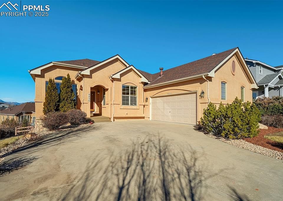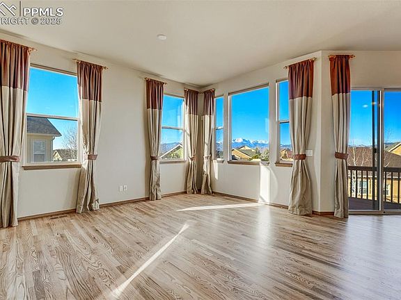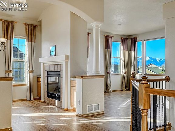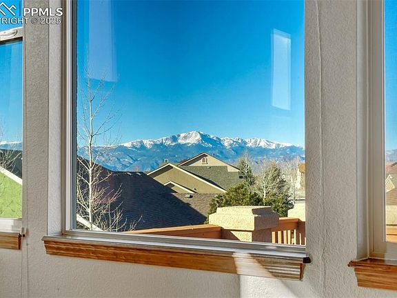 Superb Pikes Peak VIEWS from this ranch floor plan with walkout basement! Home is open, bright and inviting with plenty of windows, high ceilings and LED lights throughout. Gleaming hardwood floors flow from the entry through the living room, hallway, dining room, family room and kitchen—freshly refinished January 2025. Plus, NEW carpet, NEW furnace and NEW air conditioner—January 2025. Views from Family Room, Kitchen, 15x10 Deck, Rec Room and Master Bedroom. Family Room and Dining Room share a see-through fireplace for a cozy home feel. The Living Room is a flex space, perfect for sitting room, office, formal living, play room, etc. Spacious rooms throughout the home, lots of kitchen cabinets and a nice-sized pantry. The huge L-shaped Rec Room features a second fireplace, walkout to 10x9 concrete patio and backyard, garden level windows and a large 14x9 wet bar area with tile countertops and tile floor. All the bedrooms are spacious, and three feature large walk-in closets. Master Bedroom with plenty of windows, walkout to private balcony, 7x8 cedar-lined walk-in closet, and adjoining 5-piece bath with tile floor, double vanity, soaking tub and separate shower. Recently freshened landscaping. Low-maintenance stucco siding. Additional features include modern-design wrought iron spindles, new (2025) smoke and CO detectors, sump pump and plenty of storage with storage room and large closets. Great location just one block from Wolf Ranch Dog Park and Recreation Center Swimming Pool (membership access with extra fee). Academy District 20 schools. Great property!