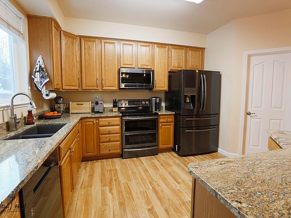 Updated South Anchorage 3 car garage home that shows outstanding! All four bedrooms on One level, 42'' cabinets in kitchen, solid surface counters, Upgraded appliances, approximately 20 foot ceiling in spacious entry and 9 foot ceiling on mail level. Private master suite w/huge walk in closet, double vanity and soaking tub. Fenced Backyard with PlaySet. Excellent Neighborhood.