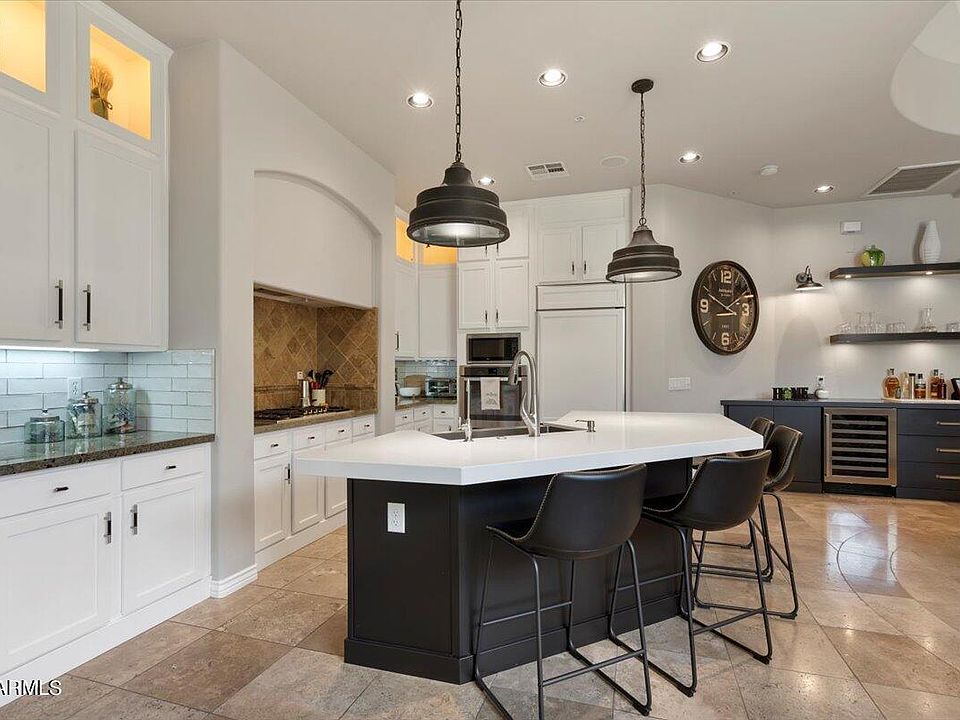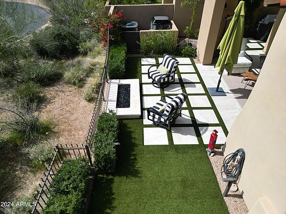 BEST IN PRICE/BEST IN SHOW in DC Ranch! Fully furnished turn-key lock and leave with all high-end furniture, features, and finishes. Furniture was selected by Kathy Harris at Harris Home Design - Crate and Barrel, Arhaus, Hooker Furniture and !! This stunning single-level Camelot Villa offers 3 bedrooms in total, 3 Baths, a den that has a sliding patrician to close off converting to a 4th bedroom for overflow guests. Main house has 2 bedrooms and a separate attached casita with a private entrance and a new Murphy Bed. Unlike other similar floor plans, the kitchen and breakfast room have been opened up for entertaining and use. A custom bar was added for functionality and focal point. Two new A/C 19 SEERs were added. The rear yard has a South view for great winter sun. Newly landscaped with turf grass, 4' concrete stones, an elongated gas fireplace, and a gas BBQ. Private gated front courtyard for privacy and security. Gated community. Do not forget that the HOA includes membership to a fantastic community center featuring pools, spas, entertainment and much more--visit the DC Ranch website for all the amenities offered. All this and walkable to DC Ranch Market Street as well as access to all DC Ranch walking paths and Community Center.