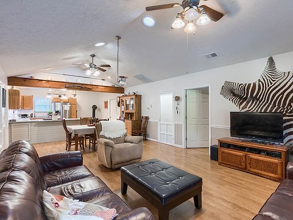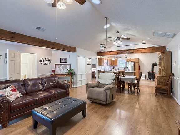 Warm, inviting, spotless clean pole-barn home with log siding on approximately two acres. Open floor plan with cabin-like atmosphere, feels like home the minute you step inside. Two or three bedrooms, smaller third bedroom currently used as office, also has a separate entrance. Spacious kitchen pantry for necessary storage. Whole house water filter. In addition to traditional lighting, propane lights have been installed in main living area if needed. Heating system and air-conditioning replaced in November 2018. Single car attached garage. The 24x24 shop features heat/air, 10' walls, insulation, 220 electric, chain hoist and lean-to for additional car or truck parking. Poured concrete patio with wooden backdrop. Fenced garden area. Luxury chicken coop, chickens included!
