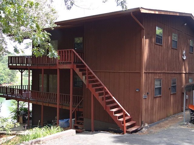 TWO FOR ONE!! This unique two story wood sided lakefront cabin has the same floor plan on the main AND on the upper level, connected by an interior stairway. There are two kitchens (main level dishwasher, fridge, microwave and range/upper level fridge, microwave and range), two washers and dryers remain, two fireplaces, two living rooms, two baths and two bedrooms on each floor, plus another bath in basement for coming in from the lake. Full, unfinished basement, plus two car carport. Basement access is from exterior only on rear of home. 504' lake frontage, and very private. 3 sheds on the 1.44 acres. Wide cove lakefront.