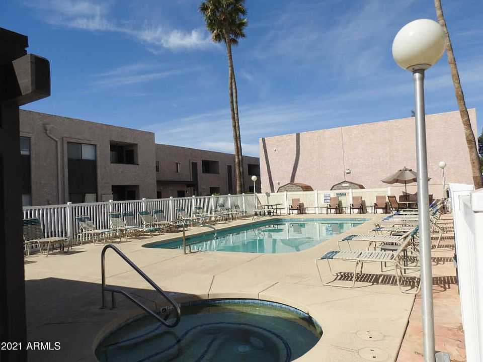 Extra-Sharp & Recently Updated throughout! This Beautiful 2 bedroom, 2 bath condo is complete with Refrigerator, Washer and Dryer! Immaculate and Well-maintained! The Kitchen Door Leads to the Fenced Heated Pool & Hot Tub & BBQ! The Main Floor Bath has a Shower & the 2 Bedrooms upstairs both have Balconies to enjoy the Beautiful Arizona Climate! This Gated Community is surrounded by single family homes. Lots of Mature Trees, Grass & Barbecue Grills! Butterfield is located close to shopping, Restaurants, 101 & 202 Freeways & Community Parks.