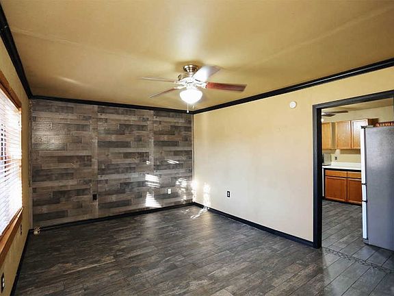 Pretty 3BR 1BA home on .34 acre. The home has been remodeled and is move-in ready. The wood-look tile floor is beautiful throughout the home. The stainless steel appliances, including the refrigerator and microwave, stay with the home. The utility is large enough for an office desk and it opens onto the covered back porch. A 10' x 12' gym/shop and a 7' x 9' walk-in storm shelter are conveniently located near the back porch. The gym has electricity and a window air conditioner. A 10' x 13' storage building with a roof overhang is also located within the chain link back yard. There's plenty of room for a garden area and a shade tree for your sitting area or your play set. The fire pit is ready for those chilly Fall nights. An additional 8' x 16' storage building sits outside of the chain link fence and has convenient access for a vehicle to drive to the building. The chain link fence has a double gate at the back of the yard for easy vehicle access to inside the fence. This home is close to I-35 and is located 50 miles south of Norman, OK.