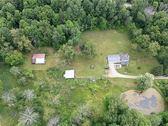 Your country oasis awaits! This home features 4 bedrooms, 1.5 bathrooms, 2 car attached garage and is situated on 8.38 acres. Stepping in from the front entry there is a formal foyer space. To the right is the cozy living room with a fireplace to sit around and enjoy. Off of the entry room to the left is the spacious eat-in kitchen with a large island in the center. There is a big bedroom that has a walk-in closet attached on the first floor, along with a full bath. You can access the attached garage from the kitchen, as well. Upstairs you will find 3 bedrooms, a half bathroom and the laundry space. The outside space offers a big pond, stocked w/ bluegill, bass and carp, a shed, a large barn for storage and a partially fenced in yard for dogs to roam, yet be contained. Check out all this property has to offer, you will not want to miss this peaceful setting in the country!! Delayed Negotiations by Sunday July 9th @ 5:00pm. FYI : OUTBUILDING IN THE FAR BACK W/ WHITE ROOF W/ STRIPES DOES NOT BELONG TO SELLER. PROPERTY LINE IN FRONT OF THAT BUILDING. SELLER WILL LEAVE SURVEY OUT ON COUNTER.