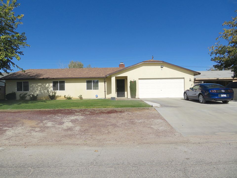Lovely 3 bedroom home on a quiet street in California City. A large mature tree shades the front lawn during the hot summers. Rose bushes grow next to the house for a pop of color. The covered entry has a security screen door for those temperate evening breezes. The door opens into a small foyer which leads to the living room with a lovely brick fireplace. Open to the living room is the dining area with a glass sliding door to the covered patio and lush backyard. The kitchen has tile countertops, vinyl flooring, and a double sink overlooking the backyard. A door from the kitchen leads into the garage. Down the hall there is a full bathroom. The showerhead has a wand for easy use. There is a window above the tub enclosure. A cabinet provides storage beneath the sink, plus there is a medicine cabinet. There are two bedrooms overlooking the front yard. They have ceiling light/fan fixtures, and good sized closets. There are blinds and curtains on the windows. There is a linen closet in the hallway. The master suite faces the backyard. It has a large walk in closet, ceiling light/fan fixture and is open to the sink area of the bathroom. There is a full cabinet beneath the sink and a wood framed medicine cabinet. The tub and toilet are enclosed together. The tub/shower has sliding glass doors and a window to the yard. The backyard is enclosed in a 6' tall block wall with a gate in the NE corner by the power pole. The is a large tree in the backyard that gives loads of shade. The covered patio is perfect for summertime entertaining. There is a cabinet stand that holds the Evap. Cooler for the garage and a small one for the sprinkler valves. The garage is oversized and seller has had as many as 4 cars inside. The garage is completely finished and has a pull down ladder for storage. There are 4 up ducts to pull the air thru the garage into the storage space. The sectional garage door is insulated and has an automatic opener. This is a honey of a home