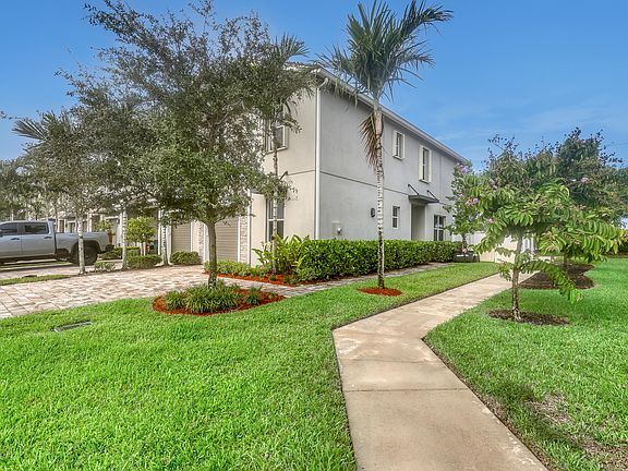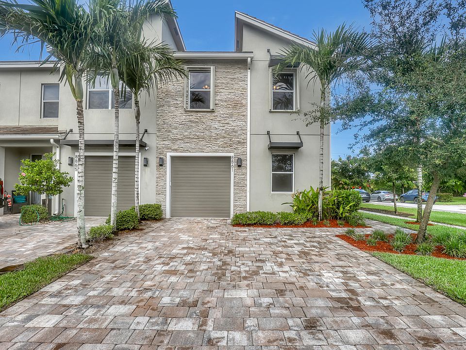 This is it... a must see spacious 4-bedroom, plus loft, 3-bath, 1 car garage with double pavered driveway, corner townhouse. The modern kitchen features stainless steel appliances, chestnut cabinetry, quartz countertops, and glazed ceramic tile flooring throughout the 1st floor. AND guest bedroom is conveniently located downstairs, while upstairs you'll find the primary suite with double sinks and walk-in closet, plus two additional bedrooms, loft, and laundry. Enjoy your private lanai with pavers, your own fenced backyard and pet-friendly living. Accordian shutters on 2nd floor. Located near top-rated schools, shopping, dining, and entertainment, this home blends comfort, convenience, and community. Welcome