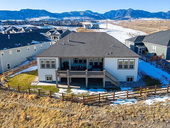 Unobstructed City Views, Mountain Views and Lake Views !!! This unique ultra-premium lot backs to open space with views of the city lights and Standley Lake, the front of the home also faces open space with a view of the Flatirons. 7 large bedrooms and 5.5 Bathrooms. This is a 6,300+ square foot semi-custom home in the Leyden Rock neighborhood that sits at the end of a private cul-de-sac, large lot, garden level fully-finished basement. Low maintenance stucco and stone exterior with security accent lighting, low maintenance yard, separate dog-run area, fully fenced, stamped concrete and large private deck with an Artesian South Seas double lounger spa. Enjoy watching the sun and moon rising from the back deck and sunsets from the front patio. Oversized 3-car sideload garage with 8' garage doors, and side mount openers so you have plenty of room for car lifts or extra storage. Modern Rustic Mountain Chalet Décor, glazed knotty Alder cabinets and wood floors, granite throughout, Lyon pattern Travertine entryway, crown molding, open floor plan. The GRAND master suite opens to the large deck. Numerous upgrades throughout including a luxurious master bath with over-sized shower with mountain views and freestanding tub. The Master and Second master suites on the main level have private views to the east. Bedrooms have double and/or walk-in closets. Separate owner's entry and butler's pantry. The kitchen has a hammered copper farm sink, large pantry, professional grade appliances, beverage fridge and powder room. Large recreation room with a full tavern bar in the lower level. Thermal black-out roman shades on all of the bedroom windows. Energy efficient heating and air conditioning is zoned for each level and a fast recovery hot water heater that never leaves you standing in the cold. Enjoy the privacy and views with all the luxuries of a planned community. Close commute to Denver/Boulder.