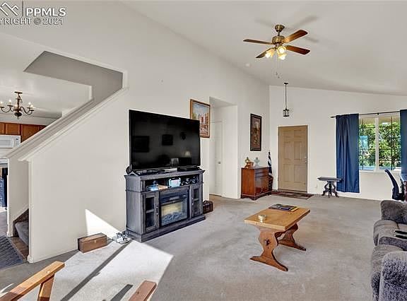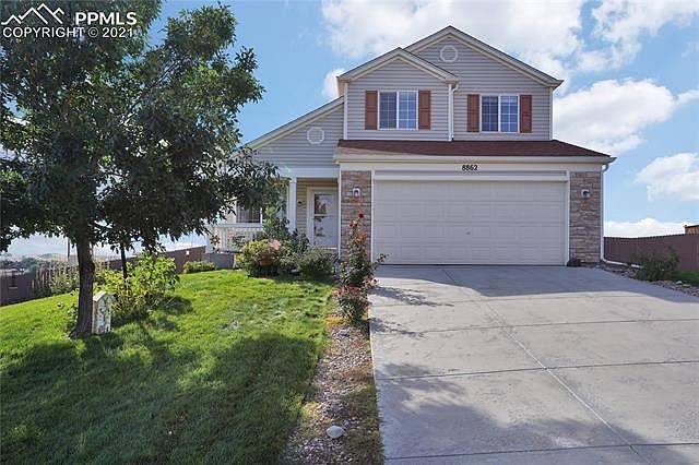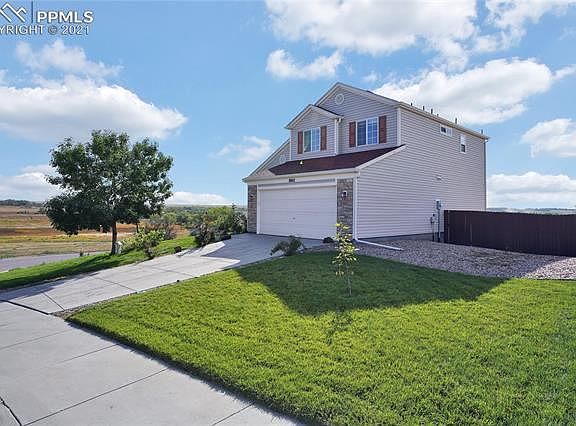 Sitting on a huge corner lot, this 2-story home has a front yard that is a gardener's delight! There's a large, fenced backyard w/ great potential which is accessed from both the walk-out basement and kitchen - onto the deck and down the stairs. The primary bedroom includes an attached full bathroom and 2 walk-in closets. All bedrooms are upstairs. Main level includes a huge living/dining room combo w/ cozy gas fireplace. The well sized kitchen includes a pantry and center island. There's room to grow with the unfinished basement. Features include a newer roof, hot water heater, furnace w/ air purifier & A/C. Enjoy wildlife of all sorts that visit the nearby pond. Near shopping, schools, parks & Ft Carson.