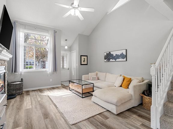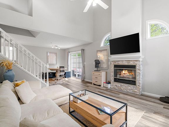 Welcome to this updated 2-bedroom, 2-bathroom end unit with a serene ambiance and an abundance of natural light. As you enter the home, the vaulted ceilings in the living room create a spacious and airy atmosphere, perfect for relaxation or entertaining. The white kitchen with stainless steel appliances, complemented by light walls and white trim, exudes a modern aesthetic. The gas fireplace adds warmth and coziness to the living space, creating the perfect setting for gatherings or quiet evenings at home. The upper level has two bedrooms, and a large bathroom that includes a soaking tub and walk-in shower. The loft area provides versatile space for an office, reading nook, or play area. The upper level also includes a new washer & dryer. Step outside to enjoy the peaceful green space and patio. With a 2-car garage & additional guest parking nearby. This quiet end unit is ideally situated near golf courses, schools, shops, and numerous parks!