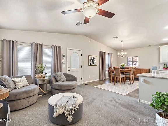 Welcome to this rare and beautifully maintained home in the highly sought-after Monte Vista Village Resort one of Mesa's premier 55+ active adult communities. Situated on a desirable perimeter lot with a block wall for added privacy, this spacious open-concept residence offers 2 bedrooms, 2 bathrooms, upgraded carpet, and an inviting, light-filled layout. The large great room flows seamlessly into a generous dining area, an extended kitchen peninsula, and a large kitchen island, creating the perfect space for entertaining and everyday comfort. The kitchen also features an oversized pantry and abundant cabinetry, while the dedicated laundry room provides additional storage.