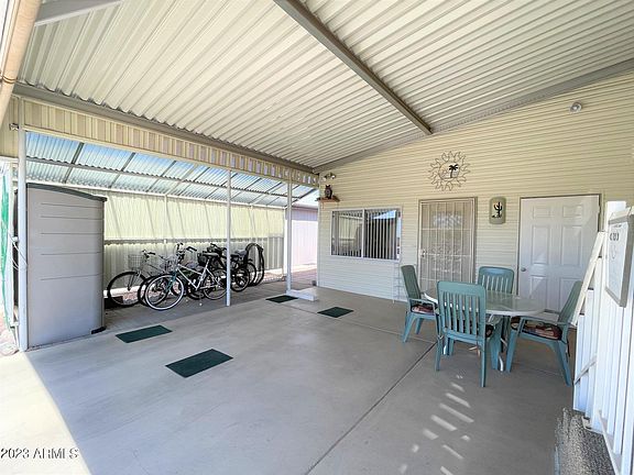 Noteworthy updates include a brand-new roof, installed just one year ago, providing both durability and peace of mind. Additionally, the water heater was replaced two years ago. Plenty of storage options with 2 exterior storage closets and free standing storage unit. An oversized carport can accommodate 2 cars or car and golf car comfortably. Located on a quiet street facing open green space you'll enjoy evenings on the patio.