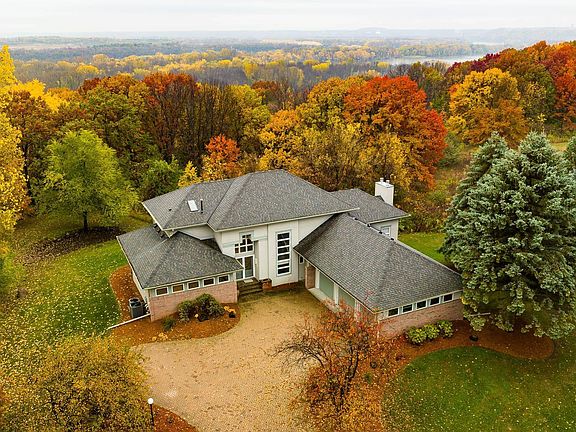 Stunning estate, escape to your private retreat nestled upon an almost 3-acre wooded parcel. Spacious open concept on the main level boasts an expansive open floor plan with large windows for natural light. The gourmet kitchen features Thermador appliances, custom cabinetry, built-in charging station, granite countertops, maple flooring, an eat-in kitchen area and a formal dining room. Enjoy multiple living areas including a living room, a family room with gas fireplace, a walkout to a 3-season porch and large deck. The upper-level features two spacious bedrooms, bathroom, and a primary bedroom with a walk-in closet, a luxury ensuite bathroom featuring a walk-in shower, dual sinks, and a soaking tub. The lower level is an entertainer's delight with a recreation room, wet bar, gas fireplace, and a walkout to the backyard. Additional bath, bedroom and office along with large storage room finishes off the lower level. Gorgeous views of the Mississippi River Valley. A must see home.