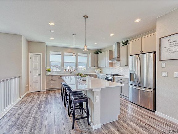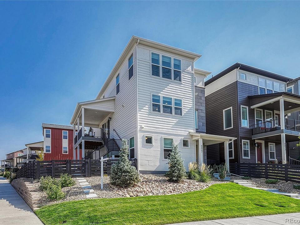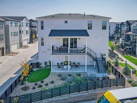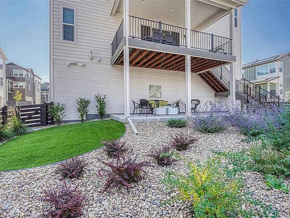 1 Year New and all the Upgrades plus Premium Lot in Crescendo at Central Park! This home is more than move in ready with substantial upgrades including a 4th bedroom and bath on the lower level. Situated on a corner, premium large lot, this home has mountain views (from kitchen, master, and deck), a large covered deck plus a patio. On the main level the kitchen has an oversized center island with quartz counters, stainless steel GE appliances, plus wide-plank hardwood flooring. The adjacent dining room and living room are large for entertaining and have upgraded lighting. Access the deck though double wide sliding glass doors! The upper level master bedroom includes a beautiful custom sliding door and built in headboard and the large master bath has an incredible shower. The upper level has 2 additional bedrooms and a full bath. The lower level has a 4th bedroom, full bath and mudroom with custom bench that leads to the attached garage with custom lighting. Window treatments included with blackout shades in all 4 bedrooms. Master bedroom and living room pre-wired for sound system. Common area with grill and covered picnic setting is just steps away. Plaza Central Park with shopping and dining is a short walk from home. This is an incredible opportunity to own one of the best homes in this new, highly sought after neighborhood - and it is available now!