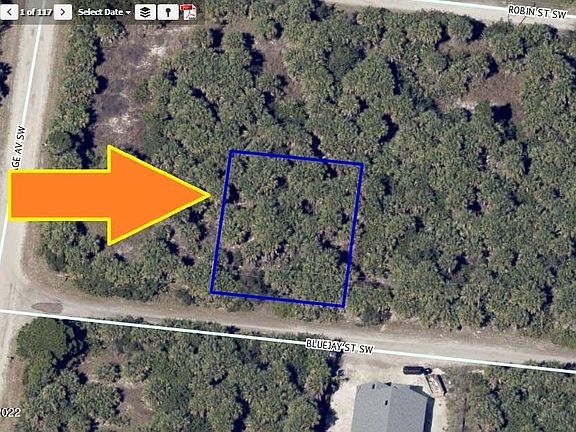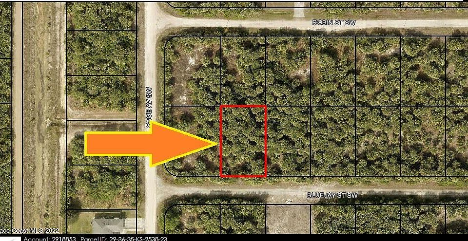 0.23 acre Single Family Residential Lot (Rs2 Zoning) available in the build-able Port Malabar Unit #49 of SW Palm Bay. Nicely located in the rural SW Section just one lot from the corner, this lot is just 3.7 miles -8 minutes- to Bayside High and Westside Elementary Schools, 5.3 miles -11 minutes- to Publix Shopping, 14.1 -30 minutes- to the Melbourne Square Mall, and just 18.5 miles -36 minutes- to the beaches and ocean in Indialantic. From Exit #173 of I-95 go west on Malabar Road NE. Turn left on San Filippo Drive SE and proceed south for 7.3 miles. Continue on Degroodt Road SW for 0.2 miles and turn left on St. Andre Boulevard Proceed 1.2 miles and turn left onto Madden Avenue. Proceed 0.4 miles and turn right on Bluejay Street. Proceed 0.2 miles and the lot will be on your right.