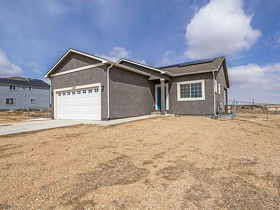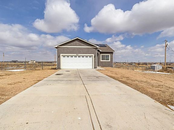 Move-in ready, enjoy this 2018 Ranch Style home with Solar on a fully fenced acre lot! Crisp and fresh it has been professionally cleaned, along with new carpets, paint and flooring! Vaulted ceilings with a center island as the focal point, stainless steel appliances, dining and formal living greet you as would walk in. Oversized primary, with private full bath and huge walk in closet. Two nice sized bedrooms and a 3/4 bath are down the hall. Off the kitchen is an access door to the backyard with a covered patio. Downstairs is a family room, the 4th bedroom, 3/4 bath and utility room (laundry location, on demand hot-water heater). Easy access to North I-25 and the Purcell Exit to get to Colorado Springs. Close to PW grocery, school, and restaurant amenities.