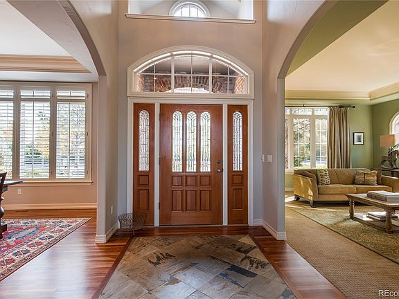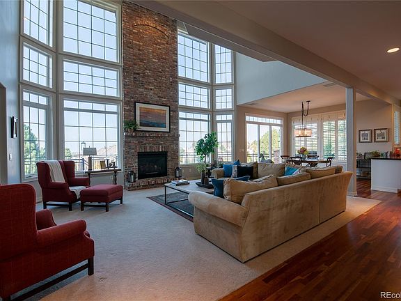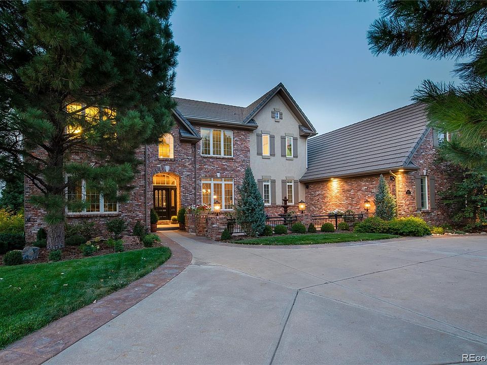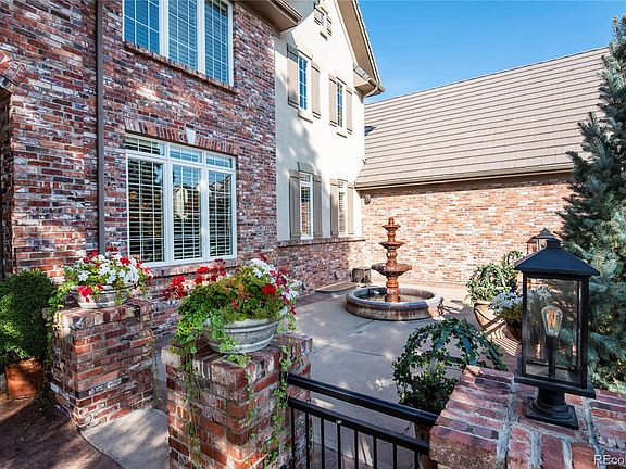 Atop a hill in the prominent Highwoods gated community, sits this spectacular, traditional brick home boasting sweeping mountain and city views. Your first introduction is an enclosed front courtyard ideal for relaxation or casual dining, with the soothing sound of a trickling water fountain creating a tranquil setting. Step into the grand two-story foyer, presenting regal living and dining rooms for formal entertaining, then continue on into an inviting family room encased by majestic floor-to-ceiling windows. You'll immediately be impressed by the architectural details of cherry hardwood floors, custom trim work, slab granite, plantation shutters and hand troweled walls and ceilings. The gourmet kitchen presents an expansive central island, a line-up of appliances to fulfill every chef's dream, and adjoining morning room with a sliding glass door leading out onto an impressive 1,153 Sq Ft deck. A serene, spacious second-level master suite provides a soothing place to unwind whether snuggling up in your favorite chair next to the gas log fireplace, or enjoying picturesque Colorado sunsets featuring epic mountain and city views on the balcony. Pamper yourself in an indulgent 5-piece master bath designed to host a sumptuous jet-action tub and dual-head glass shower with bench. Upper level secondary bedrooms provide spacious accommodations offering ample natural light; two sharing a connecting Jack & Jill bathroom while a third bedroom with ensuite bathroom is perfect for family or guests. The finished walkout basement is the epitome of additional living space complete with a rec room, exercise room, full kitchen and two additional bedrooms. Extend entertaining or family time outdoors onto a covered 1,045 Sq Ft patio, where you can explore an in-ground trampoline, unwind with a soak in the hot tub or make friendly conversation around a glowing fire pit. With every detail crafted to perfection, this is a home where friends and family will gather to build new memories.