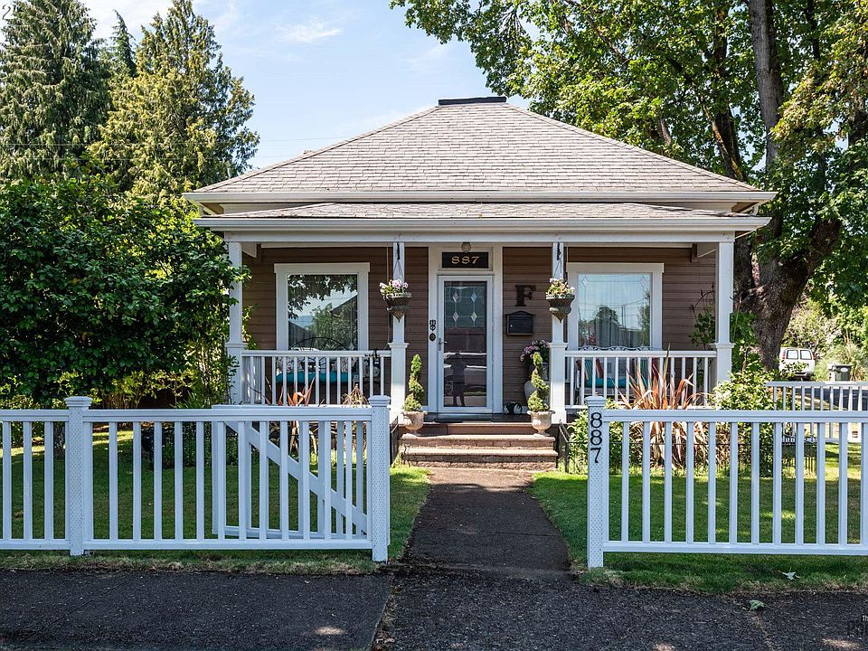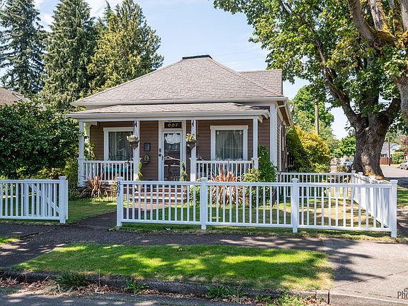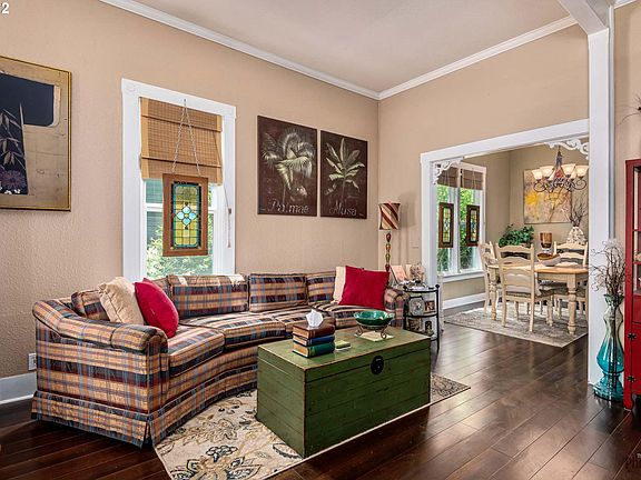 Nicely remodeled vintage craftsman home. Features a kitchen with newer cabinets, granite counter tops and tile floors and tile backsplash. Living room and dining room have bamboo floors and a natural gas fireplace. High ceilings thru out with archways, crown molding with window and baseboard moldings. Newer double pane vinyl windows. Ductless heat pump for efficient heat and ac. Covered front porch. Corner lot with fully fenced yard. Detached garage that is now a shop. Alley access. Must see.
