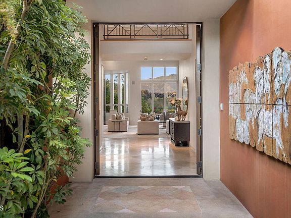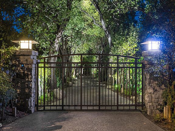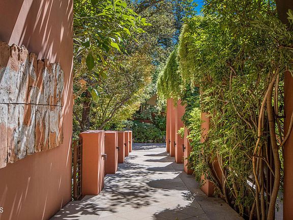 Taking full advantage of the 1.616 acre site, this exceptional Contemporary residence designed in 1995 by architect Barry Berkus has perhaps the best view of the Arroyo, Colorado Street Bridge & Vista Del Arroyo Hotel of any in Pasadena. The property has estate presence w/ a gate & drive; it is not visible from the street. The 3-story residence entered on the 2nd level has 4 bedrooms & 7 baths. The floor plan is a central hall layout opening from a dramatic bridge leading to an impressive double door entry & pavilion. Immediately to the right is a guest powder bath & handsome library w/ fireplace & built ins. A generous bar w/ double sink, granite counters & refrigerator/ice maker is adjacent. The spectacular living room has soaring 20 foot plus ceilings, a large fireplace, 2 window bays & sliding doors to the outdoor terrace. A gracious step-up formal dining area also has views & outdoor terrace access. There are staircases to the upper & lower levels as well as an elevator. There is a bedroom suite on this level. The spectacular kitchen beyond is entered through a commodious dish pantry; a food pantry is adjacent. Bright & open, the kitchen has 2 work islands; both have granite counters as do the main workspaces. There is a 6 burner plus griddle range, a convection oven & several warming drawers. The family room is open to the kitchen w/ fireplace & windows overlooking the Arroyo. There is an outdoor kitchen under a covered terrace. The principal suite is composed of a large bedroom w/ floor to ceiling Arroyo view window bay & skylights, two closets & dressing areas & a primary bath w/ spa tub, generous shower & 2 separate commodes. There are 2 additional bedroom suites on this level. Downstairs there is a wine tasting room w/ adjacent 1/2 bath & a temperature-controlled wine shop size cellar w/ 10,000 bottle capacity. The nearby media room has tiered seating for 12 in luxurious reclining lounge chairs. 2 separate double garages, a motor court, storage rooms & a pump room complete this lower level. A 2 bedroom, 2 bath guest house w/ sitting room & its own terrace is across from the residence. The lush landscaping by landscape architect Walter Young is enhanced by water features that include a pool w/ natural appearing sand bottom, a spa, streams & koi ponds all producing a relaxing background rushing water sound. 887 La Loma Road enjoys a delightfully quiet & private location.