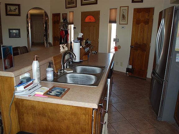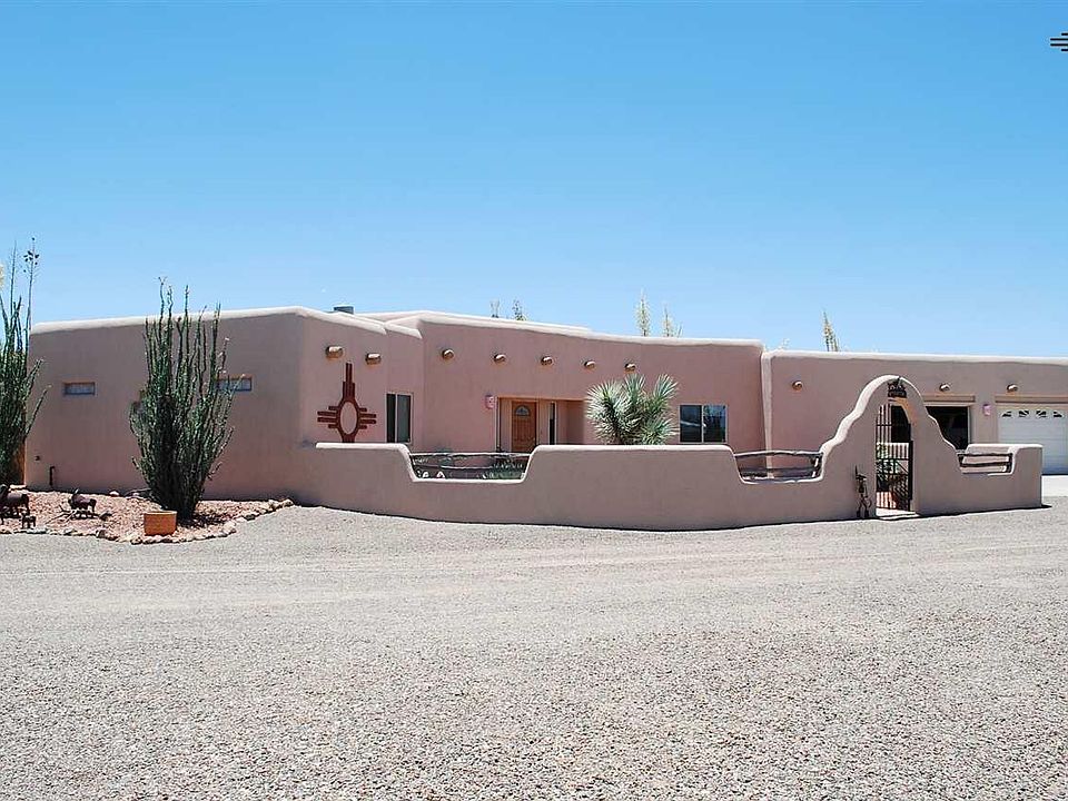 PRICE REDUCED on this beautiful southwest style home on 6 acres on a paved road not far from town. Large covered porch all around the back of the house. Great southwest landscaping. 2 covered containers for a workshop, finished inside, electricity, cooler in one. House is fenced, electric gate. RV hookups. Great mountain views.