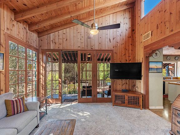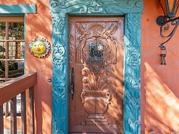 Welcome to this stunning Spanish-style private retreat, including a hand carved custom front door, offering timeless charm and modern amenities on a private, beautifully landscaped property. The main home features two bedrooms plus an office or a den with their own private balconies and slider to the private backyard and two spacious bathrooms. The inviting living spaces are accentuated by wood-wrapped windows and ceilings, adding rustic charm throughout, opening to private covered balconies. Outside, you’ll find multiple patios perfect for entertaining, along with an outdoor wood fireplace to enjoy cool evenings under the stars. The property also features a cozy detached studio casita with kitchen and bathroom,plus laundry area for guests or extended family, providing extra privacy and comfort. A circular driveway welcomes you, offering ample parking along with a newer carport/RV parking. Additional highlights include a small workshop and a separate storage room for all your projects. The property is surrounded by mountain/wood views, creating a serene atmosphere, viewing deck overlooking a koi pond (currently not full) to complete your dream oasis. Don’t miss out on this unique property that perfectly blends style, comfort, and functionality!