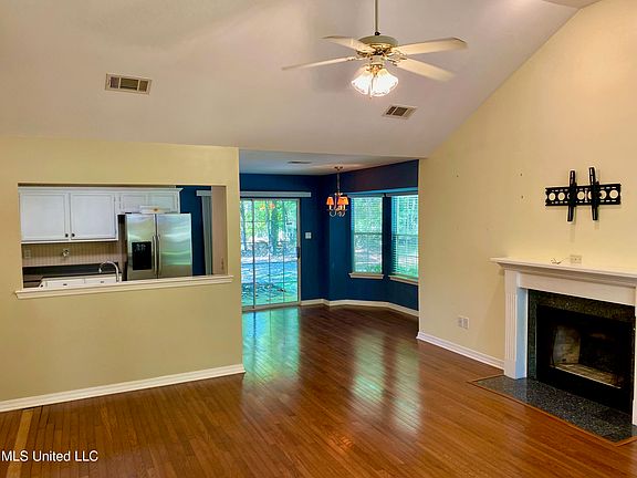 Open-concept living/dining area with wood-burning fireplace and vaulted ceilings. Large kitchen with ample cabinets. Primary en Suite Bedroom with walk-in closet and bathroom with double vanity and separate shower & tub.