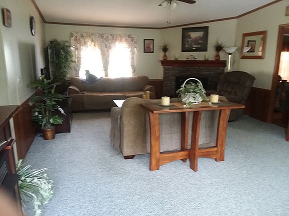 Double wide on block foundation. Heat pump/gas fireplace/woodburner. Tilt windows, covered deck, 3 outbuildings (with elec). Shown by appointment only. No rent or rent to own.