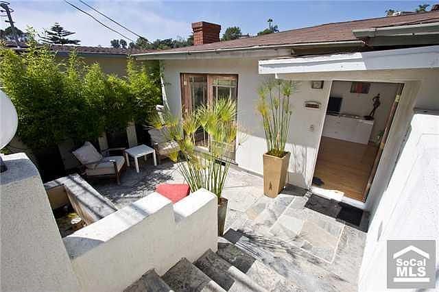 Decorators cottage close to Laguna Village. Situated on a large lot with oversized flat grassy yard. Gated entry provides privacy from the street, entering into a flagstone patio with artistic fountain. Living room with hardwood flooring, decorative lighting and gas burning fireplace with smooth stone surround. Kitchen is bright and efficient with double sink and tiled counters. Dining room can accommodate a long table has has a desk niche and also stairs to the exterior. Two bedrooms have hardwood-like laminate flooring, closet storage including one with walk-in storage. A middle room is utilized as a den or work space with pleasant views to the hills. Modern bathroom with glass bowl sink, tiled shower with glass enclosure and built-in medicine cabinet. See attached supplement for conceptual drawings for a deck with room below. Located less than a block to Bluebird Canyon Park with tot lot, concerts in the summer. Just minutes to Village shops, restaurants and beaches make this location ideal!