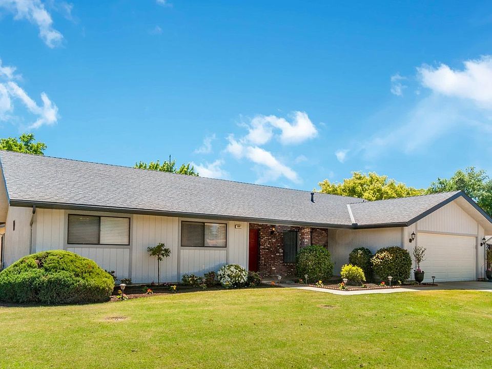 This move-in ready beautiful 3 bedroom plus den, 2 bathroom, 1,872 sqft home is located on a large corner lot, has new exterior paint, stucco and, newly painted front door with brushed nickel hardware, sprinklers on timers, and an attached 2 car garage. When you walk in the home you are greeted by a warm family room with a cozy brick fireplace. The family room has a dining area with a large bay window looking out onto beautiful climbing roses. The open floor plan is ideal for entertaining. Kitchen has dishwasher, tile counters, electric stove and oven, breakfast bar and more! The master bedroom has an updated bathroom with granite counter dual vanity and attic space for storage. Additional interior features include laundry room, textured ceilings, new paint, newer AC/Furnace, and ceiling fans. The property is beautifully landscaped with daffodils, hyacinths, a thorn-less blackberry patch, and two producing Satsuma Mandarin trees. Come visit this home to experience its charm.