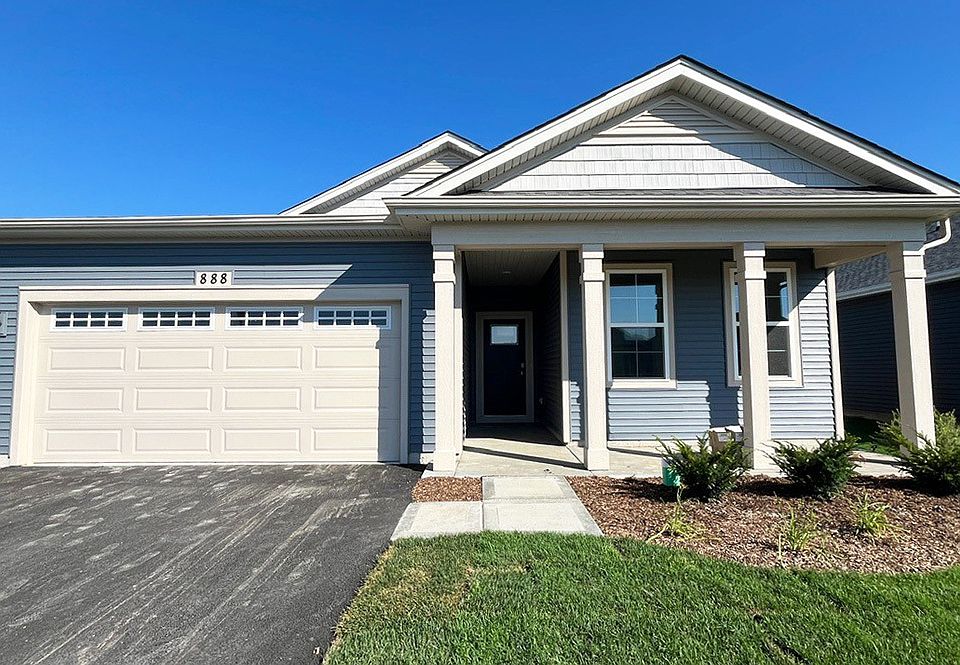 Ready for a quick move-in! New construction ranch single family home at Cambridge Lakes North! Kane county's premier master planned community! The brand new Bristol ranch single family home offers 1,744 sq. ft. of living space with 9ft ceilings, 2 bedrooms, 2 full baths, and 2-car garage. The living room and dining room open to the spacious kitchen with an oversized quartz island. Kitchen includes designer white cabinets, stainless steel appliances, large pantry, and an island with an eating bar. Primary bedroom suite offers a spacious walk-in closet and private bath with dual bowl vanity, linen closet and water closet. You'll enjoy sitting on your beautiful patio. This new single-family ranch home also includes a professionally landscaped yard with lawn care and snow removal. All Chicago homes include our Americas Smart Home Technology which allows you to monitor and control your home from your couch or from 500 miles away and connect to your home with your smartphone, tablet or computer. Home life can be hands-free. Its never been easier to settle into a new routine. Set the scene with your voice, from your phone, through the Qolsys panel or schedule it and forget it. Your home will always be there for you. Our priority is to make sure you have the right smart home system to grow with you. Our homes speak to Bluetooth, Wi-Fi, Z-Wave and cellular devices so you can sync with almost any smart device. Exterior photo of actual home. Interior photos are of a similar home. Actual home built may vary.