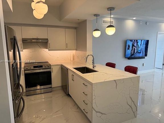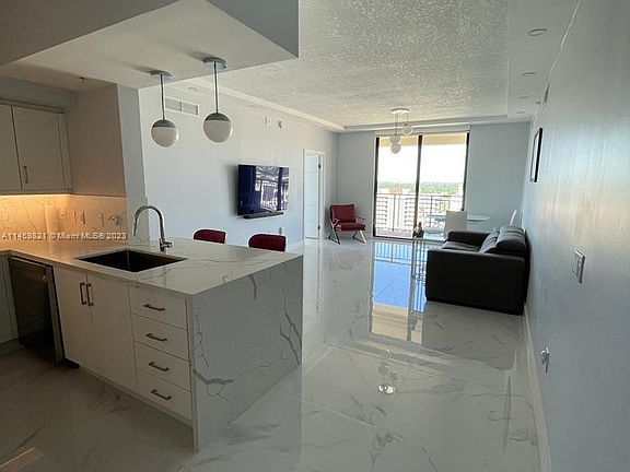 Beautiful Penthouse corner unit, underwent a comprehensive $150,000 renovation in 2022. Boasting high ceilings, this 2/2 unit with a split floor plan include: brand new AC system, installation of tankless water heater, State-of-the-art smart appliances; High quality 32X32 custom Italian porcelain flooring throughout. Completely revamped bathrooms and kitchen; motorized custom blackout shades and walking closets. Building renovations in 2022 with installation of new carpets, new paint. Pets are allowed. Complementary valet parking, water, cable, internet, pool and spa, fitness center, 24-hour open lobby and security cameras, package room, common areas on the 8th floor such as club room, meeting rooms, mini golf putting green and much more!